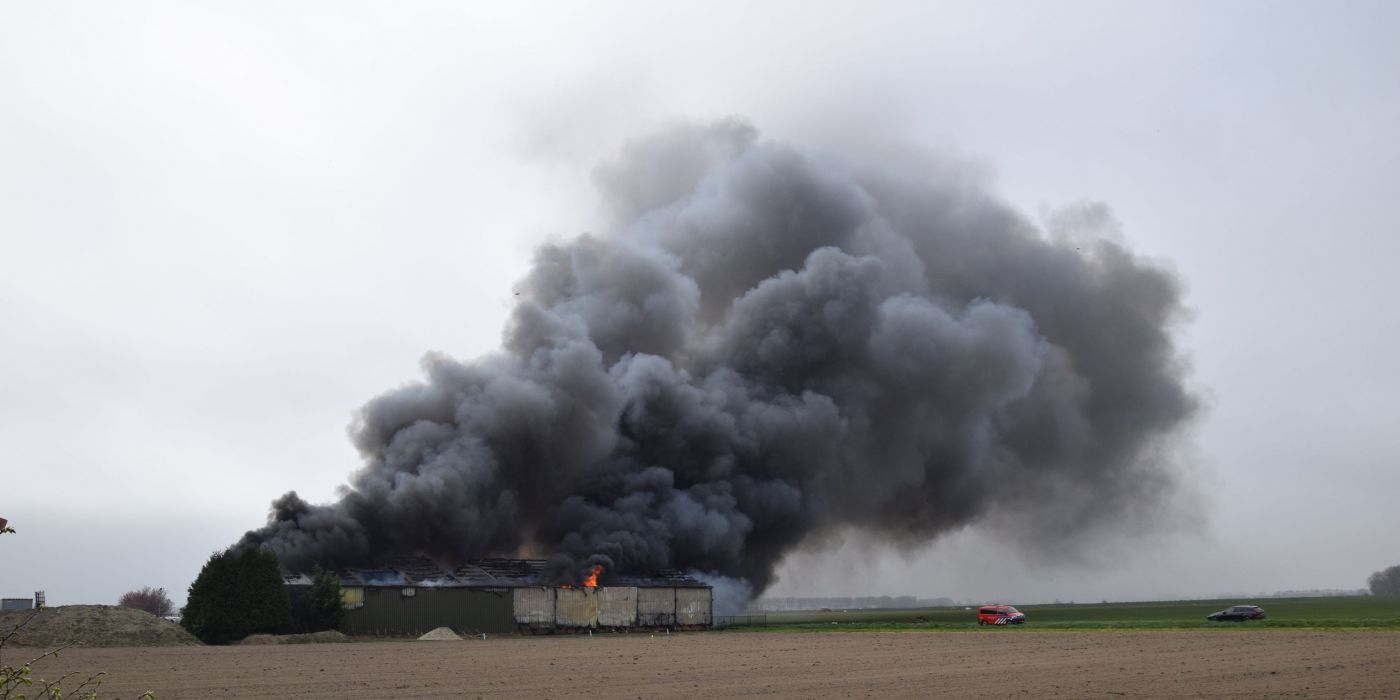 Grote brand verwoest schuur Eiersgatweg te Biervliet, rookwolk in wijde omgeving zichtbaar. zondag 27 maart om 16:28