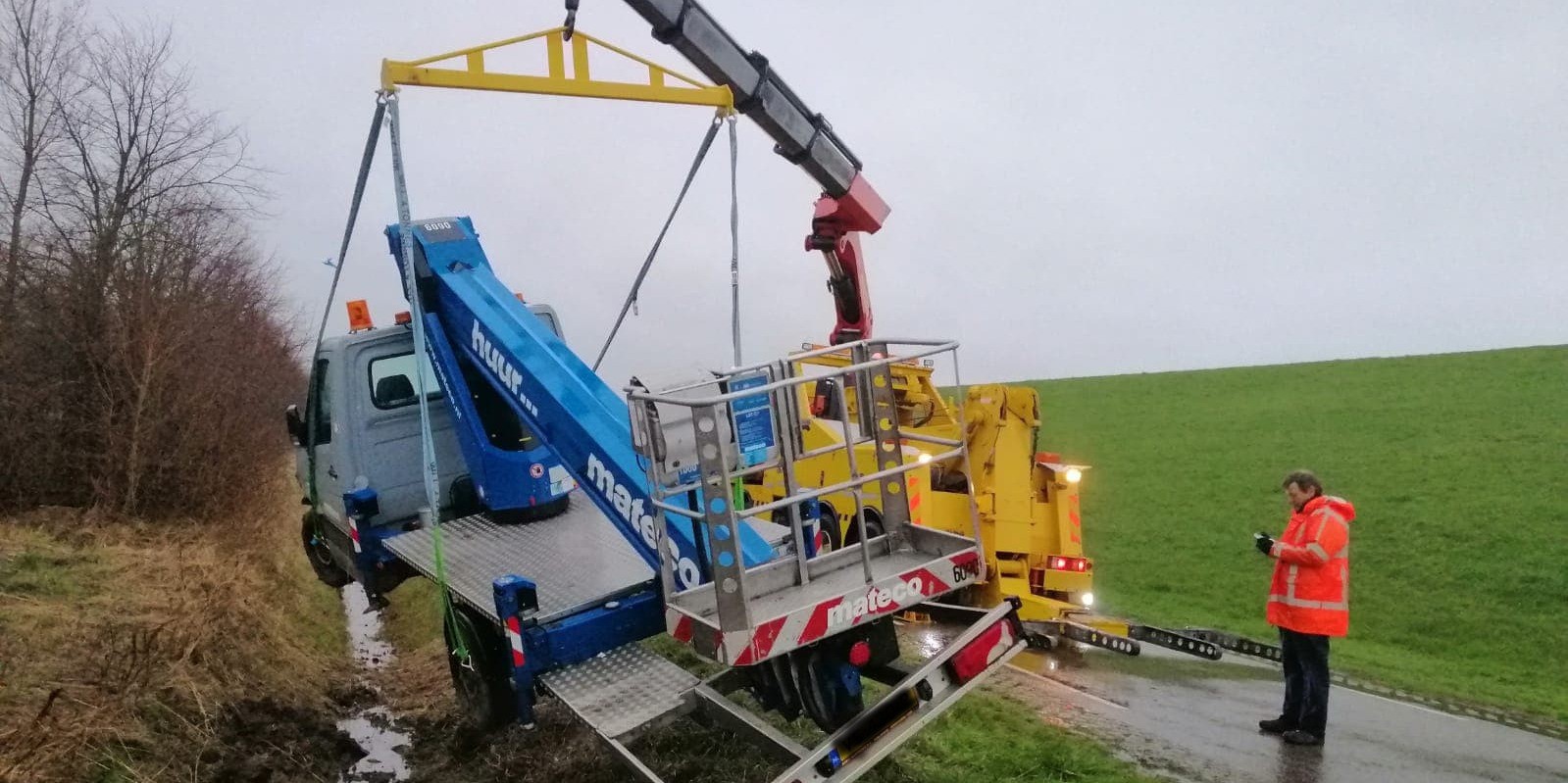 Bestelbus met hoogwerker in sloot Terneuzen