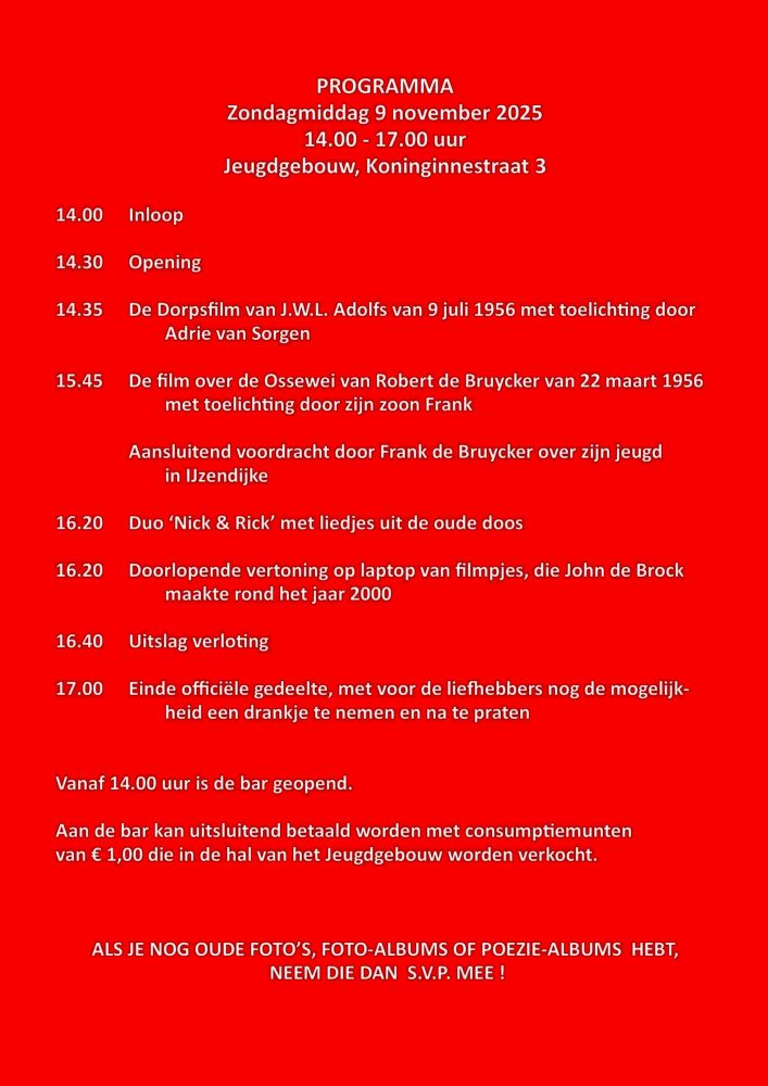 Stichting Levend IJzendijke organiseert op zondag 9 november een 'Nostalgische Middag voor (Oud-) IJzendijkenaren'. Naast filmvertoningen, lezingen en muziek is er ook een door de stichting georganiseerde expositie van nostalgische foto's, die aan het einde van de middag verloot worden onder de aanwezigen.