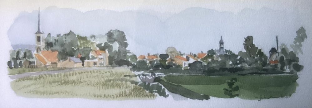 De komende week bezoeken we van maandag tot en met vrijdag vijf locaties. Eén van de plaatsen waar we komen is herkenbaar aan deze aquarel van kunstenaar Maurits Schoenmaker uit Terneuzen.