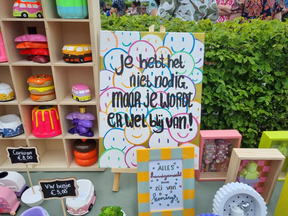 'Je hebt het niet nodig, maar je wordt er wel blij van.' Dat was één van de boodschappen van het IkToon festival bij Den Dullaert in Hulst zaterdag. Hoewel het in andere delen van Zeeuws-Vlaanderen niet overal droog bleef, viel er in Hulst op een enkele druppel na geen regen. En dat is maar goed ook: op het plein voor Den Dullaert, maar ook binnen lieten artiesten en kunstenaars, amateur en professioneel, hun kunsten zien. Bovendien was er een grote braderie met allerlei eigengemaakte en zelfbedachte hebbedingetjes en kon je gratis workshops volgen.