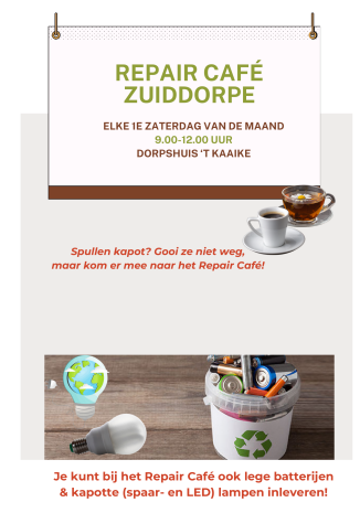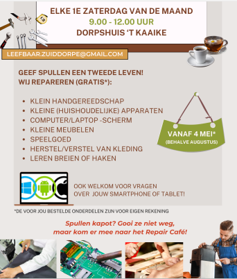 Het Repair Café Zuiddorpe is een initiatief van een groepje handige bewoners samen met het Bewonersplatform Leefbaar Zuiddorpe. In dorpshuis ’t Kaaike kun je voortaan maandelijks (behalve augustus) terecht met je kapotte spullen en een bakje koffie en thee. Meestal is de reparatie kosteloos, tenzij er onderdelen besteld moeten worden. Die komen voor eigen rekening. Je kunt ook kleding laten herstellen of verstellen.