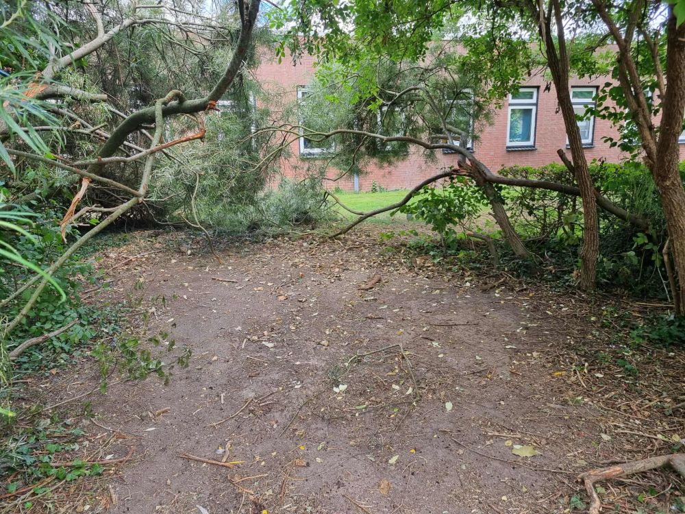 De deadline is gehaald: alleen de open plek in de bosjes naast de basisschool doet vermoeden dat er iets heeft gestaan. Verder is alles keurig netjes opgeruimd. Ondertussen is het tweehonderd meter verderop een komen en gaan van kinderen. Vrolijke stemmen, neergekwakte fietsen, een verdwaalde voetbal; wat wil je nog meer? Ze waren niet blij met de verhuizing, maar vinden het wel fijn dat de hut, die nu in de bossen bij het voetbalveld staat, daar wél mag blijven staan.