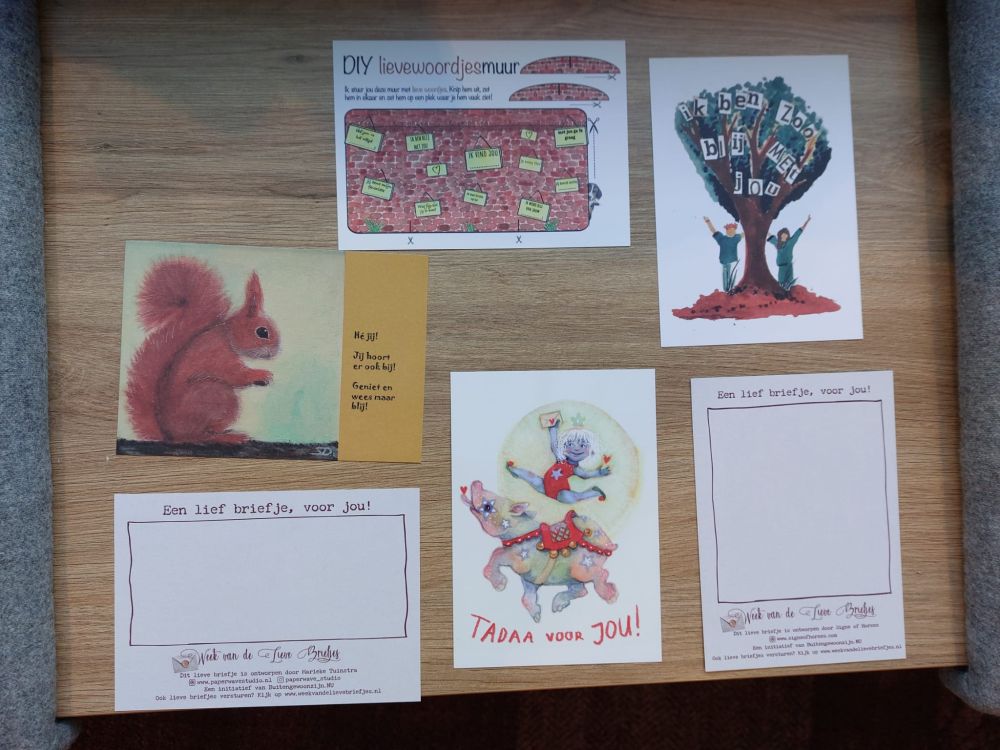 Op ansichtkaarten kun je je boodschap kwijt. "Denk aan je lieve buurvrouw, een goede vriend of misschien zelfs een onbekende." De gehele week kun je de kaartjes ophalen en schrijven in de bibliotheek. Daarna doe stuur je hem op. Wellicht krijg je nog een mooi brief terug.