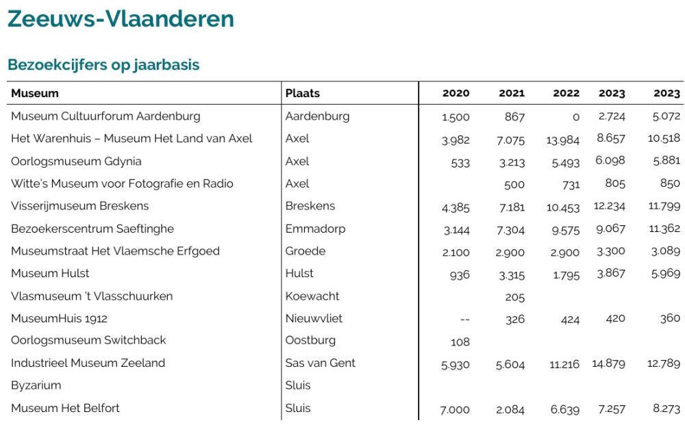 Met bijna dertienduizend bezoekers is het Industrieel Museum Zeeland in Sas van Gent in 2024 het drukst bezochte museum van Zeeuws-Vlaanderen, op de voet gevolgd door het Visserijmuseum in Breskens en Bezoekerscentrum Saeftinghe. Museum Het Warenhuis in Axel komt met ruim tienduizend bezoekers op de vierde plaats, met een stijging van bijna tweeduizend bezoekers ten opzichte van 2023. De nummer één, het Industrieel Museum, had zo'n tweeduizend bezoekers minder aan de kassa.