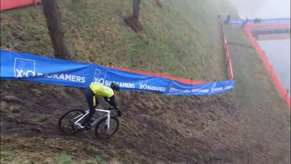 Bij een van de afdalingen op het parcours staan zo'n vier fietsers die het erop gaan wagen. "Het ziet er stijl uit, maar het moet wel gaan lukken", zegt een van de jongste van het stel. Op zijn racefiets - die is voorzien van iets dikkere banden met grip - zet hij af en laat zijn fiets voorzichtig, maar met genoeg snelheid, naar beneden glijden. Het is oppassen, want maak je teveel snelheid, lig je in het water. Rem je te hard, ga je onderuit.